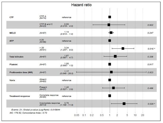 In the multivariate analysis (Figure 4), the risk for mortality was statistically significant for an initial AFP > 20 ng/mL (p = 0.02) and an incomplete response after the first TACE (p = 0.03).
