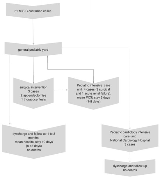 We present a retrospective observational single-center study. Most of the enrolled children were initially hospitalized in the general pediatric yard. One child with symptoms of acute renal failure at admission was referred directly to the PICU of the hospital. After the first 48–72 h, the conditions of four children worsened, with the need for a PICU transfer. Three underwent surgery (two adenectomies and one thoracocentesis), and one required non-invasive respiratory support and inotropic medication. Three children with rapidly progressing myocarditis and heart failure were transferred to the pediatric cardiology intensive care unit in the National Cardiology Hospital. There were no deaths, and the enrolled children were followed up for 1 to 6 months (Figure 1).