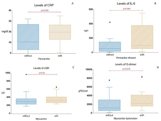 Levels of CRP depending on the presence of pericarditis (A), levels of IL-6 depending on the presence of pericardial effusion (B), levels of LDH depending on the presence of myocarditis (C), and levels of D-dimer depending on the presence of myocardial dysfunction (D).