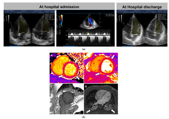 Clinically, ventricular dysfunction usually involves myocarditis, or it results from generalized inflammation or loading changes []. Ventricular dysfunction can be evaluated using echocardiography and/or cardiac MRI (CMR) [,,].