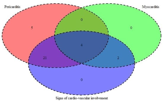 In Figure 4, we present the co-presentation of pericarditis, myocarditis, and signs of cardiovascular involvement in the MIS-C patients.