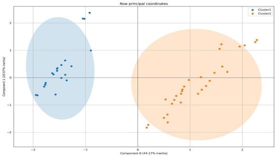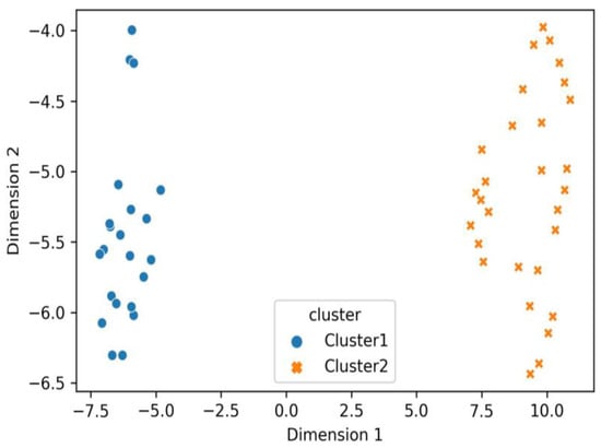 Figure 6 and Figure 7 provide visualizations of the two patient clusters for the purposes of explanatory data analysis. We can see that both clusters are entirely separable and thus generalize the combined presentation of clinical, ultrasonographic, and clinical parameters regarding cardiovascular involvement. For diligence, one of the two clusters was termed Cluster 1, including 43% (N = 22) of the subjects. The other cluster, Cluster 2, contained 57% (N = 29) of the study subjects enrolled (Figure 8). No gender and age-related differences were observed between the clusters. Regarding blood pressure, Cluster 2 was associated with a lower for age blood pressure levels, p = 0.05. In Cluster 2, patients with pericarditis (93% of Cluster 2 and 90% of all pericarditis patients, p = 0.001), cardiovascular symptoms (100% of Cluster 2 patients and 100% of all patients with cardiovascular symptoms, p = 0.001), myocardial dysfunction (p = 0.011), pericardial effusion (p = 0.001), and septal and heart wall dyskinesia (p = 0.002) predominated. Thus, Cluster 1 included children without cardiovascular symptoms. Cluster 2 generalized the MIS-C children with mild and severe cardiovascular involvement, combining pericarditis, myocarditis, heart failure, and low blood pressure. Also, subjects from Cluster 2 displayed elevated levels of fibrinogen (5.7 ± 0.3 vs. 4.6 ± 0.3, p = 0.03) and IL-6 (158 ± 36 ng/mL vs. 66 ± 22 ng/mL, p = 0.032), inflammatory markers suggestive of a cytokine storm.