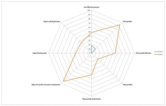 Radar plot displaying the involvement of the cardiovascular system across Cluster 1 and 2 patients, expressed as the percentage of patients positive for different features depicted on the radar plot axes.