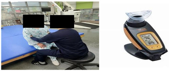 To integrate breathing exercise into the intervention, a 15 min chest mobilization exercise was followed by a 15 min breathing exercise program, during which the maximum inspiratory pressure (MIP) was measured using K5 (Power breathe, Southam, UK). The patient sat in an upright position with a straight back and waist and exhaled as much air as possible from the lungs through a mouthpiece, followed by a rapid and forceful inhalation, repeating the process 30 times (1 set). After a one-minute rest, the patient proceeded to the next set, performing three sets in total. If the patient felt dizzy or fatigued during the exercise, the exercise was immediately interrupted and resumed after a rest period of comfortable breathing (Figure 1).