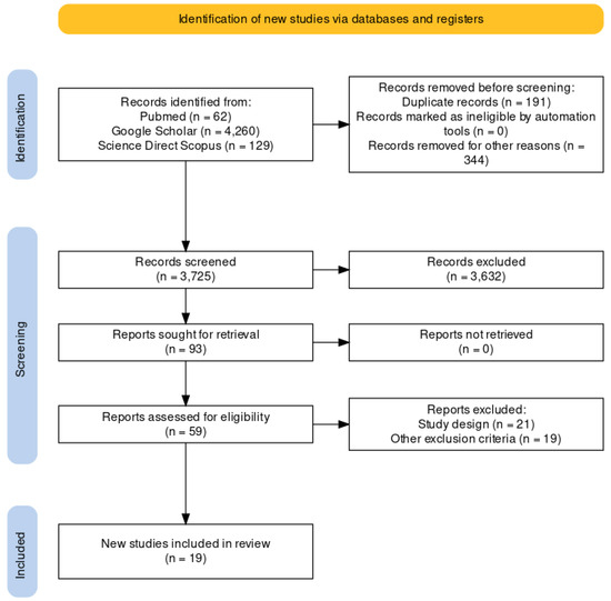 A review of the titles and abstracts, as well as a manual search of the reference lists, was carried out. The reference lists of all identified articles were reviewed to find missed literature. This search identified 93 articles, which were then screened based on their abstract. The resulting 93 papers were screened to exclude duplicates, which left 59 articles for further consideration. Non-English papers were excluded [n° 344], and the following inclusion criteria were used: (1) original research articles, (2) reviews and mini-reviews, and (3) case reports/series. These publications were carefully evaluated, considering the main aims of the review. This evaluation left 19 scientific papers comprising original research articles, case reports, and case series (see Figure 1).