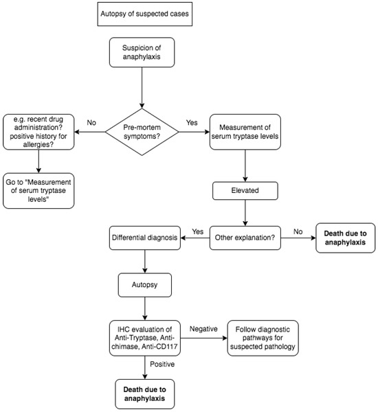 - Da Broi, U.; Moreschi, C. Post-Mortem Diagnosis of Anaphylaxis: A Difficult Task in Forensic Medicine. Forensic Sci. Int. 2011, 204, 1–5. [Google Scholar] [CrossRef] [PubMed]