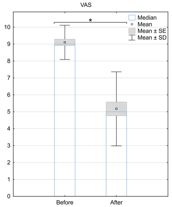Figure 1. Reduction in pain according to the VAS scale 6 months after the implantation of BurstDR™. SE—standard error, SD—standard deviation, * Indicates statistical significance at a significance level of p < 0.05.