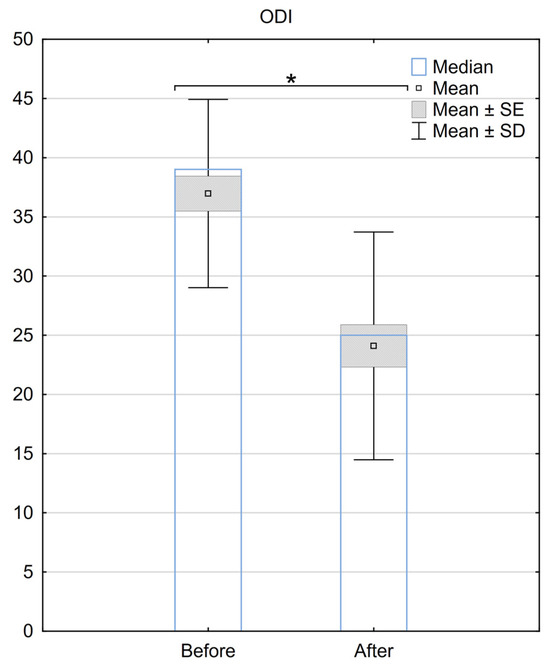 Figure 2. Reduction in the ODI scale 6 months after the implantation of BurstDR™. SE—standard error, SD—standard deviation, * Indicates statistical significance at a significance level of p < 0.05.
