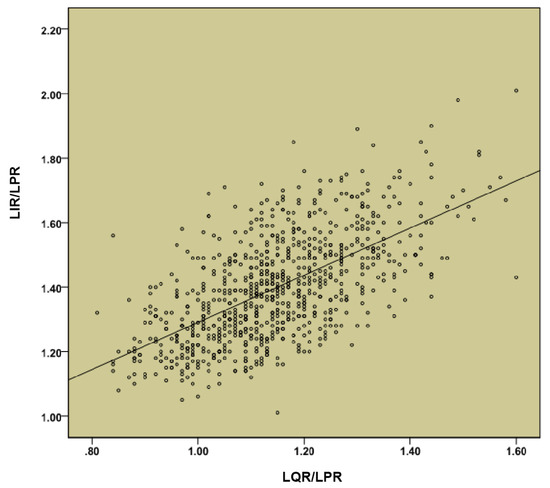 Correlation analysis between length of the iliac region (LIR)/length of the pubic region (LPR) and length of the quadrilateral region (LQR)/LPR.