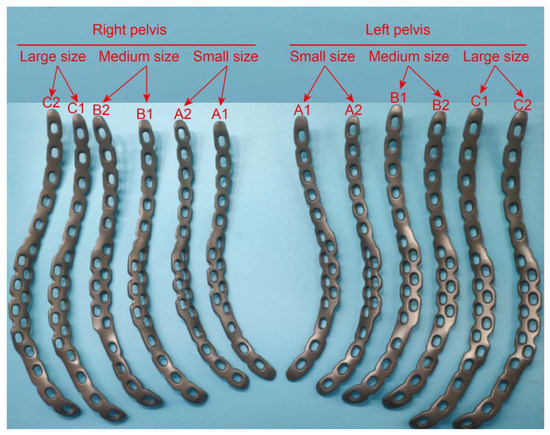 According to aforementioned methods, a total of six models of the DAPSQ plate (A1, A2, B1, B2, C1, C2) was designed. Detailed parameters of each model are summarized in Table 5. Figure 7 presents the third-generation standardized titanium plates of DAPSQ (a total of 12 plates for the left and right pelvis). The results for the validation experiment showed that the small size plate met the use requirements of 129 (15.47%) cases. Of them, the A1 plate type satisfied the requirement of 112 cases, type A2 plate satisfied the requirement of 104 cases, and 87 cases could use either the A1-type or the A2-type plate. As for the medium size plate, it met the use requirements of 546 (65.47%) cases including 501 cases with type B1, and 424 cases with type B2. There were 378 cases that could use either the B1-type or the B2-type plate. For the large size plate, it met the use requirements of 112 (13.43%) cases. Theoretically, the type C1 plate satisfied 102 cases, type C2 plate satisfied 79 cases, and 69 cases could use either C1-type or C2-type plate. Overall, all the six types of plates were available for a total of 787 cases, accounting for 94.36% of included cases.