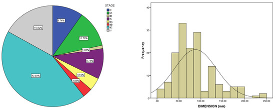 In our cohort, the stage distribution included: 9.7% in stage IC, 11.8% in location IIA, 1% in stage IIB, 9.8% in stage IIC, 4.1% in stage IIIA, 3.1% in stage IIIB, 43.6% in stage IIIC, and 16.9% in stage IV. Therefore, two-thirds of the patients (66.7%) were diagnosed with an advanced stage of the disease and metastasis. Most patients presented with large ovarian tumors, with a mean size of 87.6 ± 47.8 mm (range between 10–250 mm) (Figure 1). The CA125 level at diagnosis was elevated in 76% of patients, with a mean value of 616 ± 922 U/mL (range 4–4892 U/mL). Additionally, significant ascites (>500 mL) was observed at the diagnosis in 35.8% of patients.