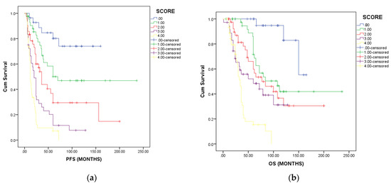 Each additional risk factor contributed to a statistically significant reduction in PFS (p = 0.0001) and OS (p = 0.001). Patients with no risk factors and a score of 0 had not reached median PFS and OS (Figure 2a for PFS and Figure 2b for OS). Patients with one risk factor had a median PFS of 70 months and an estimated median OS of 108 months. Patients with two risk factors had a median PFS of 36 months and a median OS of 77 months. Patients with three risk factors had a median PFS of 20 months and a median OS of 60 months. Patients with four or more poor prognostic factors had a median PFS of 12 months and an estimated OS of 34 months. These data sustain the use of the clinical prognostic score in the patient’s initial evaluation.
