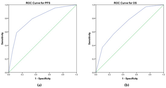 ROC curves were used to validate the prognostic score and to characterize its sensibility and specificity. The prognostic score has an area under the curve of 0.799 (p = 0.0001, 95%CI 0.721–0.86) for PFS and an area under the curve of 0.726 (p = 0.0001, 95%CI 0.710–0.850) for OS. Therefore, these results demonstrate that this prognostic score could be helpful in medical practice due to its good sensibility and specificity (Figure 3a for PFS and Figure 3b for OS).