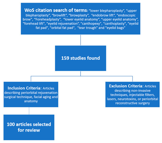 The Web of Science TM citation index was used to identify the 100 most-cited articles related to the topic of periorbital rejuvenation. Articles that were published in the English language from January 1989 to April 2020 were included in the study. The last 3 decades were selected as the timeframe of our study to ensure that the articles included were fundamental yet relevant to current periorbital surgical techniques. The terms “lower blepharoplasty”, “upper blepharoplasty”, “browlift”, “browplasty”, “endobrow lift”, “endoscopic brow”, “Foreheadplasty”, “lower eyelid anatomy”, “upper eyelid anatomy”, “forehead lift”, “eyelid rejuvenation”, “canthopexy”, “canthoplasty”, “eyelid fat pad”, “orbital fat pad”, “tear trough”, and “eyelid bags” were used in the citation search. The Web of Science Core Collection database was used in the search. A manual review of the initial 159 studies identified was performed. Articles that described non-invasive techniques, injectable fillers, lasers, neurotoxins, or periorbital reconstructive surgery were excluded. Articles describing periorbital rejuvenation-related surgical techniques, facial aging, and anatomy were included. After identifying the articles meeting the inclusion criteria, the top 100 were chosen to be highlighted in this article (Figure 1). In addition to citation count, the articles were further categorized by publication year, publishing journal, corresponding author’s primary specialty, focus of article, corresponding author’s country of residence, type of study, and level of evidence. The level of evidence was determined based on the methods described by Sullivan et al. [17].