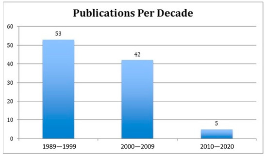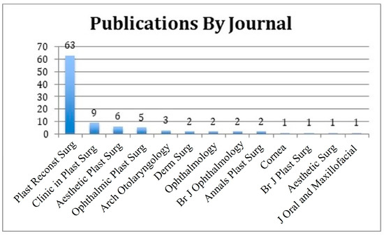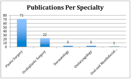 The initial search was limited to 159 articles. Then, the abstracts of the most-cited 159 articles were individually reviewed. The 100 most-cited articles on periorbital rejuvenation are listed in this study (Table 1). The 100 most-cited articles were published between 1989 and 2020, spanning a 30-year period. The mean number of citations per article was 75 (standard deviation—SD: 42). There was a higher prevalence of articles published between 1989 and 1999 (n = 53) than later decades (Figure 2). Most articles (81%) were published in plastic surgery journals, of which 78% were published in the Plastic and Reconstructive Surgery Journal (n = 63) and originated from the United States (n = 82, 82%) (Figure 3 and Figure 4). Plastic and reconstructive surgery was the primary specialty of the corresponding authors in 71% of articles (n = 71), followed by oculoplastic surgery (n = 22) (Figure 5).