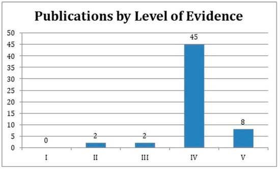 Of the 100 articles, 69 described surgical techniques, followed by anatomy (n = 22) and aging (n = 9). Clinical studies encompassed 57% of the top 100 most-cited articles, followed by review articles (n = 29) and basic science studies (n = 14). Clinical articles were classified according to their Level of Evidence. None of the studies provided level I evidence. Two studies [18] qualified as providing level II evidence, and two articles [19,20] provided level III evidence. Of the remaining 57 most-cited clinical studies, 45 studies (79%) provided level IV and 8 provided level V evidence (14%) (Figure 6).