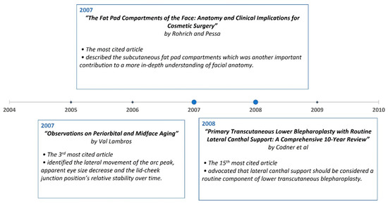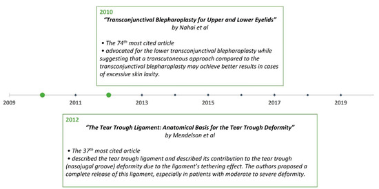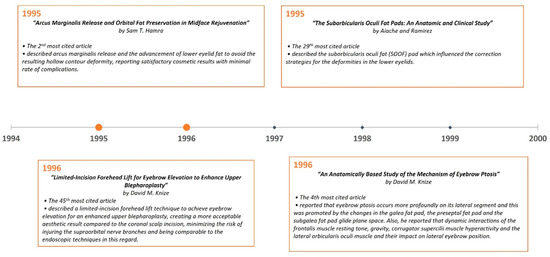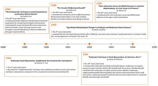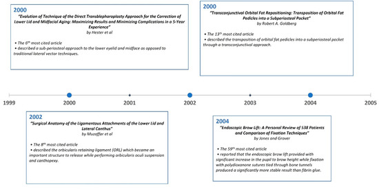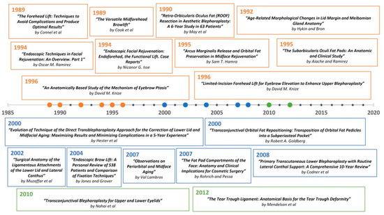 An in-depth understanding of the periorbital anatomy and corresponding sub-units is paramount when planning rejuvenation in this area [14,15,16]. As various rejuvenation techniques have been introduced over the last 3 decades and our understanding of periorbital anatomy and aging has evolved, we aim to highlight the important milestones in our understanding of periorbital aging and the anatomy and evolution of periorbital rejuvenation surgical techniques. The 100 most-cited articles on aesthetic periorbital surgery were identified and presented in chronological order to serve as a resource for surgeons and trainees. Current approaches to eyelid and eyebrow rejuvenation are also presented.