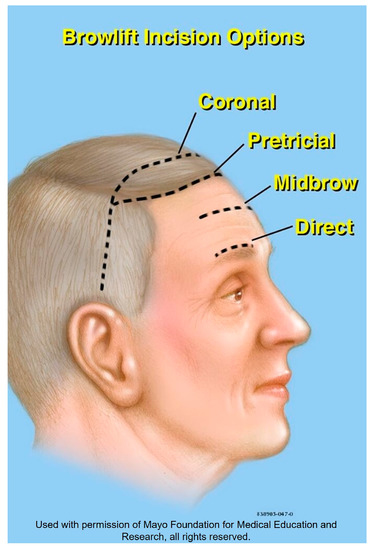- Troilius, C. Subperiosteal Brow Lifts without Fixation. Plast. Reconstr. Surg. 2004, 114, 1595–1603. [Google Scholar] [CrossRef]