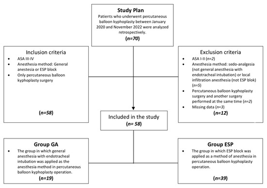 A total of 70 patients underwent percutaneous balloon kyphoplasty, and our study was completed with the remaining 58 patients after the exclusion criteria were applied. The patients were divided into two groups according to the anesthesia method applied (Figure 1). Group GA: general anesthesia group (n = 19) and Group ESP: ESP block group (n = 39). Age, gender, ASA classification, number of surgical levels, surgical urgency, and duration of surgery of the groups were compared. It was compared with intraoperative and postoperative metrics to assess whether ESP block could be an alternative to general anesthesia. These data include whether the operation was completed with the current anesthesia method, whether there was a need for intraoperative rescue analgesia, operation time (minutes), postoperative complications, whether there was a need for postoperative ICU, number of postoperative ICU days, and number of postoperative hospitalization days.