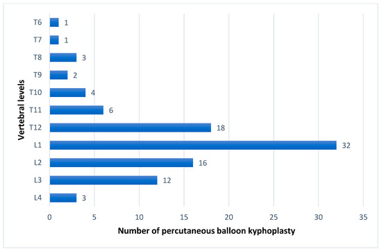 In addition, the vertebral levels that underwent percutaneous balloon kyphoplasty ranged from T6 to L4. The most frequently operated vertebra was L1 vertebra with 32 (32.6%) (Figure 2).