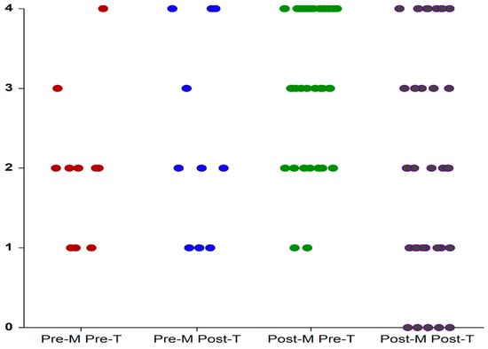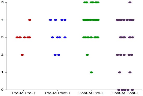 GPFSB3 score before treatment (Pre-T) and after treatment (Post-T) with local estrogens in patients with OAB of premenopausal (Pre-M) and post-menopausal (Post-M) onset. Each dot depicts an individual patient. T: treatment; M: menopause.
