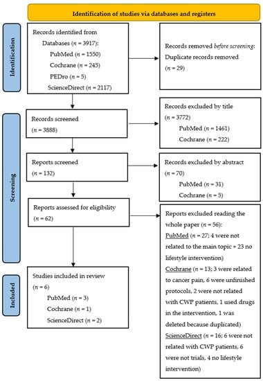 A total of 3917 studies were identified by searching the PubMed, Cochrane, PEDro and ScienceDirect databases. No other studies were added from other sources. After removing the duplicates and screening titles, abstracts, and full texts, we selected eight articles. In a secondary screening, one from PubMed was discarded because the intervention was not completely related with our topic, and one from Cochrane was discarded because the registration of the Roman et al. [] manuscript was included in the PubMed section. Six articles were therefore selected for this review, with 337 participants in total. Three studies were conducted in Europe (Spain, Italy and Denmark) and three in Asia (China and Turkey).