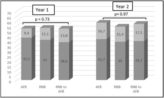 Table 2 shows the clinical characteristics of study groups during the treatment period. The 3 loading dose treatment was completed significantly more in the RNB to AFB group (63.8%) when compared to AFB (55.8%) and RNB (54%) groups (p < 0.01). However, there was no significant difference in loading dose completion time among groups (p = 0.091). The mean number of injections before RNB to AFB switch was 5.82 ± 2.2 (range: 3–10). The mean number of visits in the first year was similar (around 7 visits) in all groups (p = 0.55). However, the AFB group showed significantly more visits (4.12 ± 1.9) in the second year when compared to the RNB (6.28 ± 2.1) and RNB to AFB (6.8 ± 2.1) groups (p < 0.01). In the first year, eyes in AFB group received significantly fewer injections (4.43 ± 1.7) in comparison to the RNB (5.3 ± 1.8) and RNB to AFB (5.39 ± 1.8) groups (p < 0.01). However, when it comes to the second year, eyes in the RNB to AFB group received significantly more injections (3.48 ± 1.9) when compared to the AFB (1.92 ± 1.5) and RNB (1.98 ± 1.8) groups (p < 0.01).
