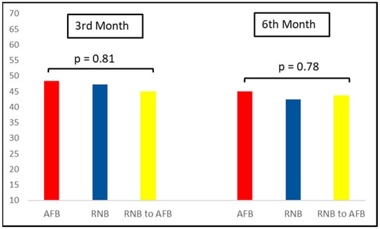 Figure 2 shows the percentage of eyes that demonstrated a decrease in CMT ≥ 20% at month 3 and month 6. At month 3, the percentages were 45%, 43.7%, and 42.4% in groups AFB, RNB, and RNB to AFB, respectively. The percentages for month 6 were 48.4%, 47.3%, and 45% in groups AFB, RNB, and RNB to AFB, respectively. There were no significant differences between all groups at month 3 and month 6 (p = 0.81 and p = 0.78, respectively).