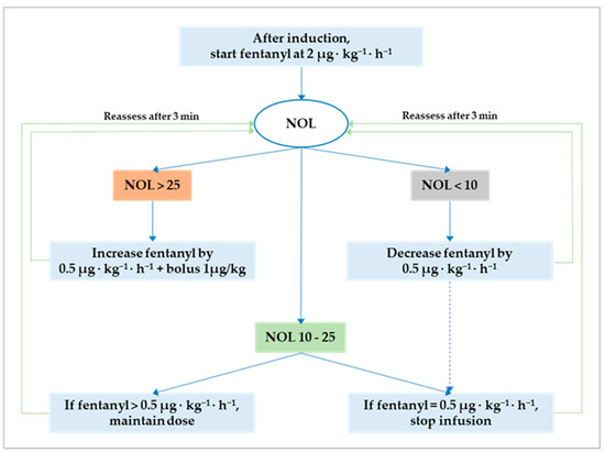 Anesthesia was maintained either with sevoflurane before and after CPB or propofol during CPB. The NOL index was continuously monitored and available for decision-making only from the induction of anesthesia until CPB initiation. This restriction is inherent to the photoplethysmographic nature of the input signal that renders the output (i.e., the NOL index) ineffective during CPB and potentially faulty after CPB discontinuation due to temporary cardiac pacing. In both groups, intraoperative fentanyl administration followed a standard protocol to attain optimum NAN balance defined as a NOL index between 10 and 25 (i.e., 10 ≤ target NOL index ≤ 25) on a scale from 0 (i.e., absence of nociception) to 100 (i.e., extreme nociception). The original NAN protocol is reiterated herein [18]: (1) after induction, start fentanyl at 2 µg·kg−1·h−1 in both groups; (2) if the NOL index is >25 for more than 60 s, increase the infusion by 0.5 µg·kg−1·h−1 and bolus 1 µg/kg; (3) if the NOL index is <10 for more than 60 s, decrease the infusion by 0.5 µg·kg−1·h−1; (4) after a dose change, allow an observation window of three minutes; and (5) stop the fentanyl infusion when it reaches 0.5 µg·kg−1·h−1 with the NOL index ≤ 25 for more than ten minutes (Figure 1). After CPB initiation, fentanyl administration was left to the discretion of the attending anesthetist, who had to pursue hemodynamic stability within 15% of the mean arterial pressure recorded during optimum NAN balance.