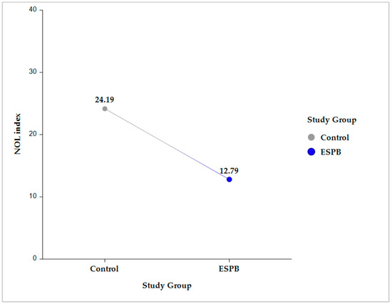 Compared to the control group, the ESPB group had a significantly lower NOLav, 12.78 ± 0.8 vs. 24.18 ± 0.79 (p < 0.001) (Figure 2).