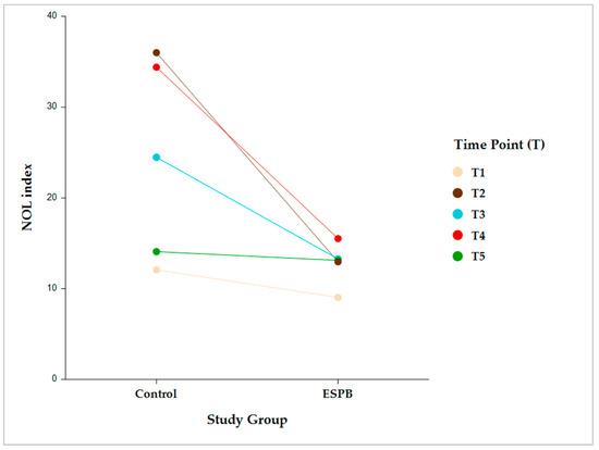 The NOL index was not significantly different between any two consecutive time points in the ESPB group. Conversely, the control group exhibited significantly different NOL index values between all the consecutive time points (p < 0.001) (Table 2).
