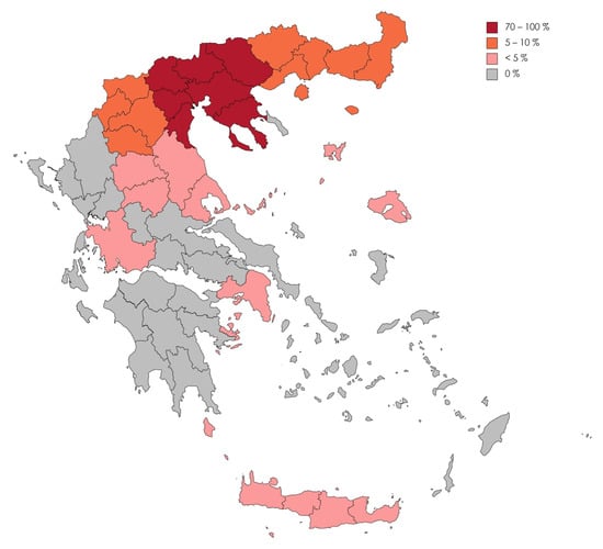 A map of Greece and the frequency of Rare Neurological Diseases admissions to the 2nd Department of Neurology, AHEPA University Hospital of Thessaloniki, according to the geographic regions of Greece.