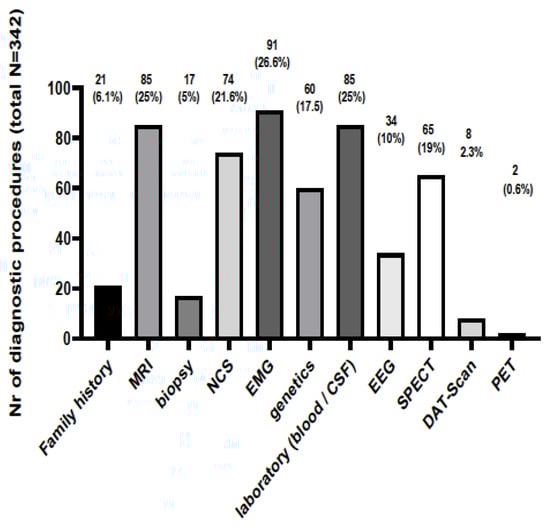 The number of diagnostic procedures and the clinical data that led to the diagnosis of a Rare Neurological Disease. MRI: Magnetic Resonance Imaging; NCS: Nerve conduction study; EMG: Electromyography; CSF: Cerebrospinal fluid; EEG: Electroencephalography; SPECT: Single-photon emission computed tomography; DAT-Scan: Dopamine Transporter Scan; PET: Positron Emission Tomography.