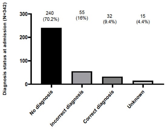 The frequency of patient admissions to the 2nd Department of Neurology, AHEPA University Hospital of Thessaloniki and the resulting diagnosis: patients were either undiagnosed (no diagnosis), had received a wrong diagnosis (incorrect diagnosis) or were previously diagnosed correctly (correct diagnosis). Unknown means lacking data.