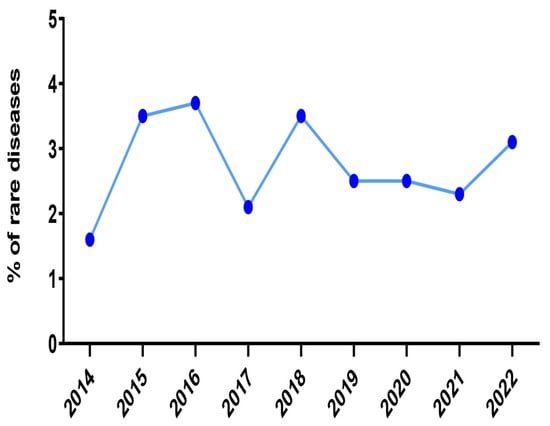 Concerning the incidence of RND cases that were admitted in our department, the rates displayed a remarkable decline during the biennium 2020–2021 (Figure 4). In particular, during the year 2020, among the 1036 patients that were hospitalized, twenty-seven patients (2.6%) were diagnosed with an RND. This percentage was even lower the next year (2.3%), although the absolute number of newly diagnosed RND cases was almost stable (28 out of 1200 hospitalized patients). In contrast, the highest rates were recorded during the decade 2015–2016 and the year 2018 (3.5%, 3.7% and 3.5%, respectively). The decline in the incidence coincides temporally with the COVID-19 pandemic and this could have significantly affected our results.