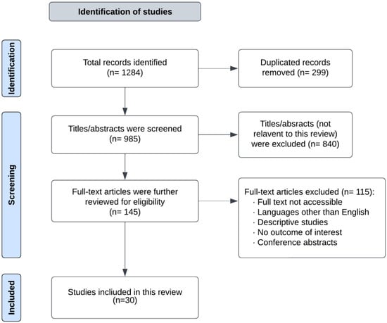 A comprehensive literature search was performed using PubMed, Cochrane Reviews, Google Scholar, SpringerLink, and Scopus database platforms for relevant articles. Articles that were published in the past 10 years, from 1 July 2012, to 1 July 2022, were considered in the review. The search terms used included ‘gestational diabetes’ and ‘lifestyle interventions’, or ‘physical activity’, or ‘dietary interventions and ‘prevention’, were included in the search. The articles obtained from the search were assessed for topic relevance and hand-reviewed to further find related publications. Randomized controlled trials (RCTs), meta-analyses, systematic reviews, and cohort studies were included. Only articles that involved interventions for adults (18 and older) randomized and non-randomized studies involving intervention groups (with diet and/or physical activity) and control groups (without intervention or standard treatment/placebo) were also included. Meta-analyses that included RCTs that measured the effect of physical activity, dietary interventions, combined lifestyle interventions, and supplements on the prevention of GDM were included. In total, 1284 articles were identified in the initial search. After the removal of 299 duplicates, 985 titles or abstracts were screened, of which 840 were not relevant and were excluded. The remaining 145 full-text articles were further reviewed for eligibility, leading to the elimination of 115 full-text articles due to the inclusion criteria, as outlined in Figure 1. Therefore, 30 articles were included in this review.
