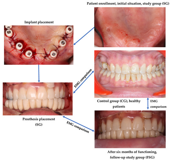 All considered patients were subjected to clinical and paraclinical examinations in order to determine the available quantity of bone for implant placement. Additionally, a general health status check was completed. Patients from the SG received two-piece dental implants that were immediately loaded. EMG analysis of masticatory muscle function (i.e., masseter and temporal) in static regime and during chewing of 5 g of almonds were performed immediately after fixation, as well as (for FSG) after six months of functioning. The obtained statistical data were used to perform comparisons between groups. Figure 1 presents a scheme of this workflow that is detailed in the following.