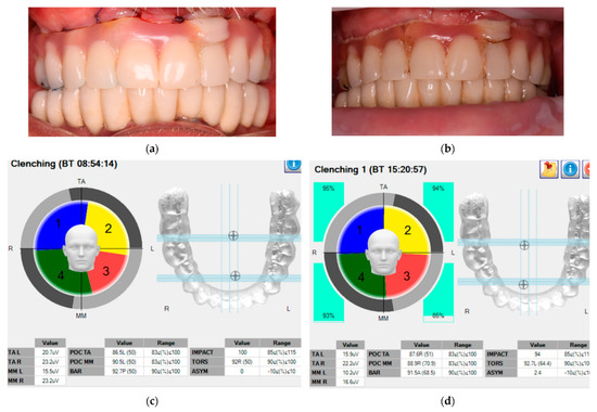 Evaluation of the EMG activity during maximum voluntary contraction (MVC) of newly inserted prosthesis: (a) clinical view after fixation; (b) clinical aspect after 6 months. The analyses in (c,d) represent graphic interpretations of the EMG activity for the situations presented in (a,b), respectively.