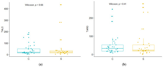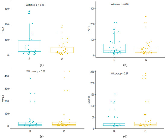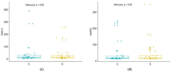 Comparative evaluation of muscle activity between the study group (S) and the control group (C): (a) TAL0—left temporalis muscle; (b) TAR0—right temporalis muscle; (c) MML0—left masseter muscle; (d) MMR0—right masseter muscle.