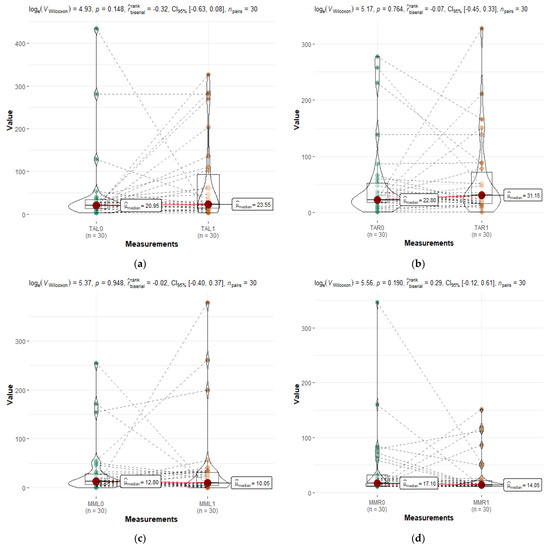 According to the statistical analysis, the following values were obtained: TAL loge(VWilcoxon) = 4.93, p = 0.148, r = −0.32, CI95%[−0.63, 0.08], n pairs = 30; TAR loge(VWilcoxon) = 5.17, p = 0.764, r = −0.07, CI95%[−0.45, 0.33], n pairs = 30; MML loge(VWilcoxon) = 5.37, p = 0.948, r = −0.02, CI95%[−0.40, 0.37], n pairs = 30, and MMR loge(VWilcoxon) = 5.56, p = 0.190, r = 0.29, CI95%[−0.12, 0.61], n pairs = 30.