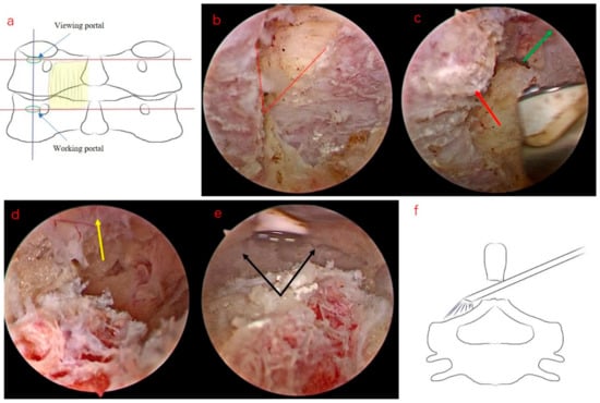 - Zhu, C.; Cheng, W.; Wang, D.; Pan, H.; Zhang, W. A Helpful Third Portal for Unilateral Biportal Endoscopic Decompression in Patients with Cervical Spondylotic Myelopathy: A Technical Note. World Neurosurg. 2022, 161, 75–81. [Google Scholar] [CrossRef]