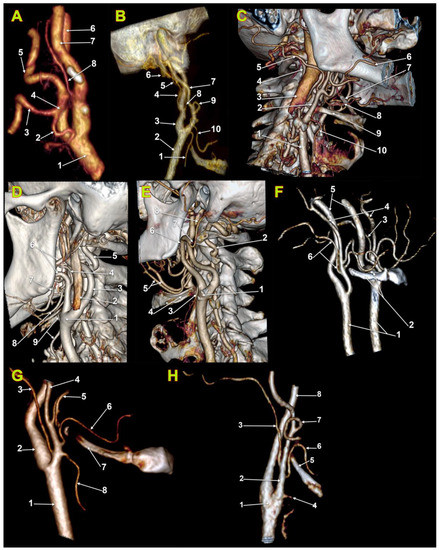 - Cobiella, R.; Quinones, S.; Aragones, P.; León, X.; Abramovic, A.; Vazquez, T.; Sanudo, J.R.; Maranillo, E.; Olewnik, L.; de Blas, C.S.; et al. Anatomic mapping of the collateral branches of the external carotid artery with regard to daily clinical practice. Ann. Anat.-Anat. Anz. 2021, 238, 151789. [Google Scholar] [CrossRef] [PubMed]
