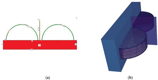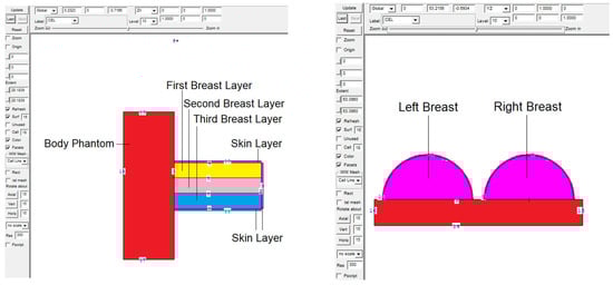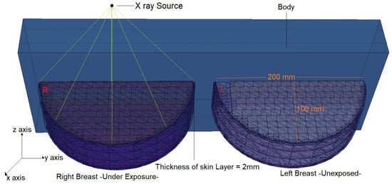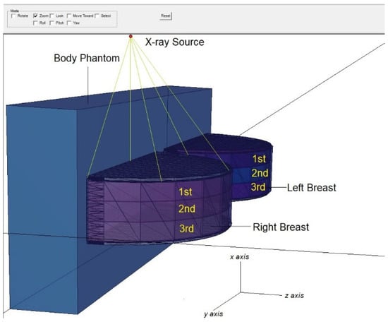 Figure 2 shows the positioning of the X-ray source across the entire modelled geometry and its exposure to the right breast. Moreover, the modelled three layers [] in the right and left breasts are seen in Figure 2. As can be seen, there is no material between the right and left breasts. For this scenario, each energy value was measured five times, and the average results were derived. During this phase, no protective equipment is used, and separate values are recorded for the right and left breasts. Figure 3 depicts the top view of the modelled overall geometry and the axial depiction of the right-breast exposure. As shown in Figure 3, the diameter of the breast model, which includes a 2 mm thick skin layer, is 200 mm and the radius is 100 mm. In the second main phase of the simulation, a protective material is defined between the right and left breasts.