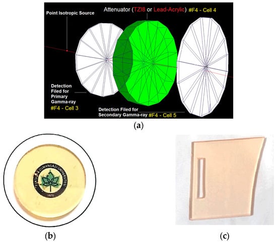 (a) Modelled MCNPX setup for transmission factor (TF) calculations; (b) physical appearance of TZI8 glass sample []; (c) physical appearance of lead-acrylic screen used by Koo and Lee [].