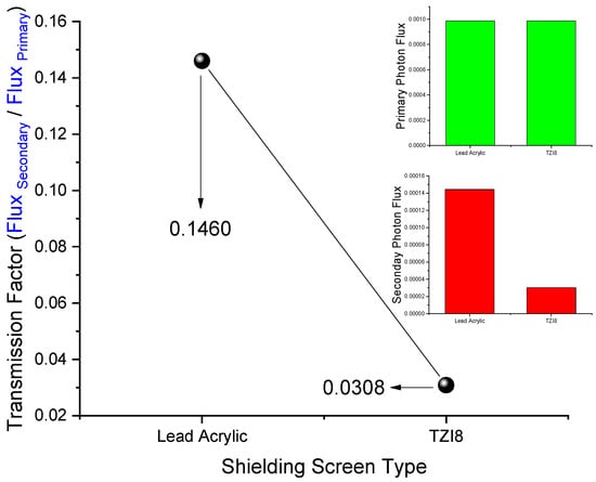 Before the primary assessment step, in which the phantom and protective screens provide the changes in the amount of energy deposited in the unexposed breast, the transmission factors of the used protective screens were calculated. This computation was reviewed as a preliminary step, and the primary photon-flux reductions through the protective TZI8 and lead-acrylic shielding screens were computed and firstly compared with the following phase of calculations. The transmission factor is the ratio of the amount of secondary photon flux (also known as the secondary photon beam) passing through the absorber material to the quantity of primary photon flux (the primary photon beam) [,,,]. The small secondary-flux value is associated with the material’s high absorption, and because the primary-photon-flux value is constant, this ratio is expected to be small in materials with superior absorption properties. Figure 5 illustrates the TF-value-calculation scheme used through the MCNPX code, along with the physical appearances of the TZI8 glass sample and lead-acrylic screen.
