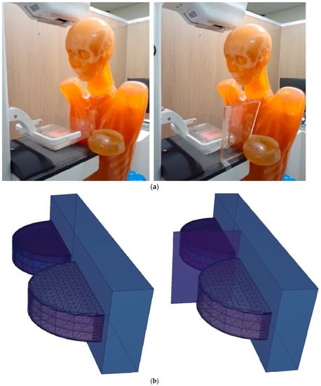 (a) Designed clinical setup for assessment of radio protectivity through lead-acrylic shielding screen by Koo and Lee []. (b) Designed MCNPX breast phantom using same parameters as clinical setup.