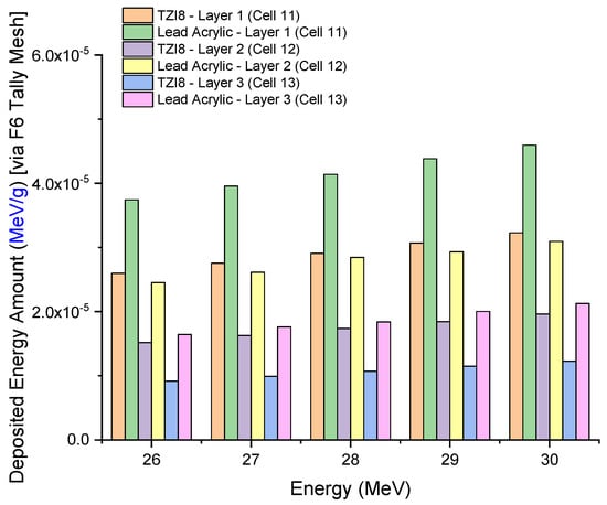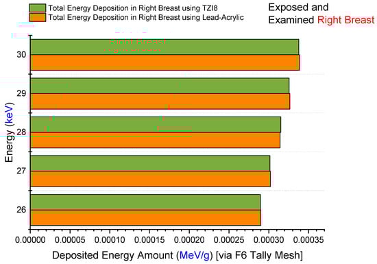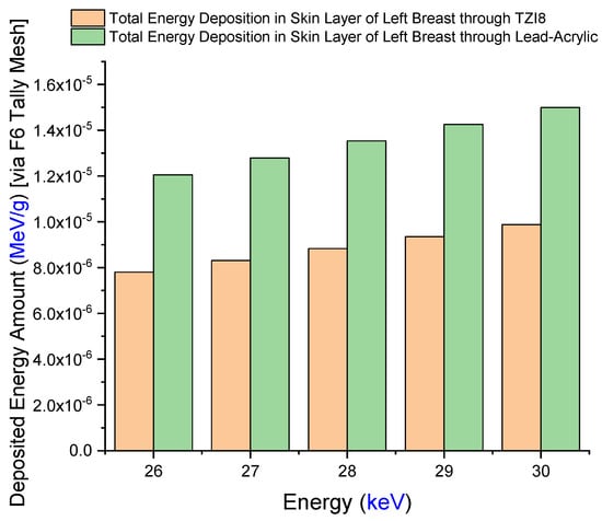 In situations when TZI8 is implemented as a protective screen, the overall skin dose is much lower than when lead acrylic is used. In fact, this is a previously noted observation associated with total breast dose. Since the volume of the whole skin layer is much less than the geometry of the modelled breast, the values in Figure 10 are significantly less than the energy deposited in the breast. This condition may alternatively be seen as the outcome of a discrepancy in volumes. In addition, for TZI8 and lead acrylic, the amount of energy deposited in each layer of the three-layer heterogeneous breast utilized in this investigation and recently suggested in the literature was evaluated separately. Figure 11 depicts the variation of deposited-energy amounts in three breast layers of unexposed and shielded left breast, using TZI8 and lead-acrylic shielding screens. As seen in the figure, X-rays release most of their energy in the first layer, for each energy value. In addition, when TZI8 was used, the quantity of energy deposited in each layer of the preserved and unexposed left breast was less than when lead acrylic was employed. The overall quantity of energy deposited in the left breast, as described in the previous sections, is the sum of the values obtained from each layer. Consequently, the TZI8 protective screen has a clear advantage over the lead-acrylic protective screen in terms of TF values, the total amount of energy deposited in the skin layer, and the total amount of energy deposited in the protected left breast, and it is reported to be a more effective protective material for patients undergoing mammography examinations. MCNPX, one of the Monte Carlo radiation-transport codes, is confirmed using clinical data, and is one of the most widely used Monte Carlo radiation-transport methods for medical applications in the scientific literature. In addition, the fact that the generated code was highly consistent with the data shown in the AAPM TG-195 [] reports was a significant indicator of the code’s compatibility with other extracted data. Nonetheless, this is simulation research, and it is essential to test this in clinical environments. Moreover, the obvious superiority of the outcomes based on simulation does not render these materials better in terms of cost and durability. In the next stages of manufacturing and clinical testing, the research team intends to conduct a full cost and pricing analysis, to shed some light on this limited situation.
