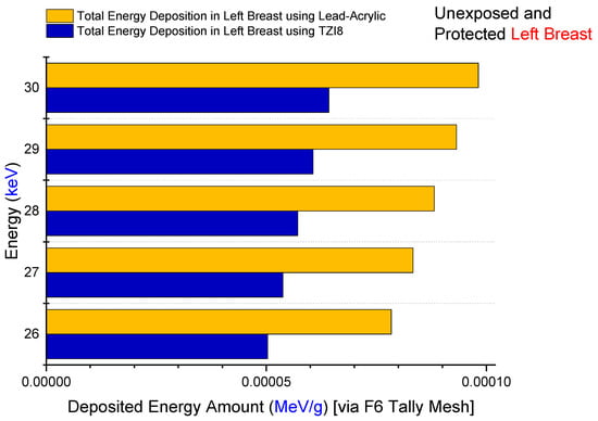 Variation in deposited-energy amount in unexposed and shielded left breast.