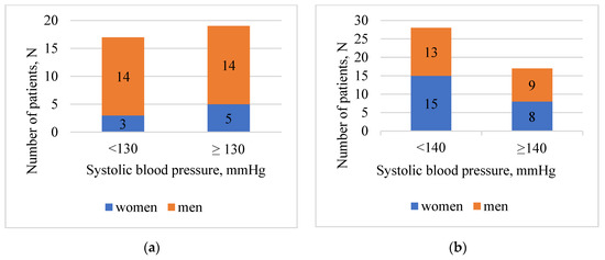 Findings showed that 32 (39.5%) subjects among all 36 (44.4%) hypertensive patients, were receiving FDC antihypertensive medications, where one of the components was AML. Most of the patients, 69 (85.2%) were overweight or obese. According to hospital and home systolic blood pressure measurements, patients in age group <65 years (hospital—52.8%, home—54.8%) were more careless about their health, and less compliant to target blood pressure as patients in ≥65 years (hospital—37.8%, home—26.7%) group. Furthermore, patients in age group ≥65 years were more often reaching target diastolic blood pressure (hospital—80.0%, home—97.7%). In addition, 16 (19.8%) patients confirmed that used to forget to take their medicines as prescribed by a doctor. In Figure 1 patients were divided into two groups: <65 years (a) and ≥65 years (b) according to gender. Each group was split into two subgroups according to hypertension guideline recommendations for target blood pressure values.