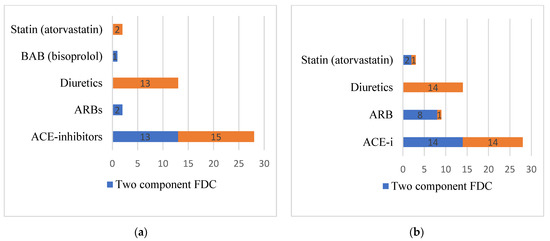 Pharmacological groups used by patients in FDC with the amlodipine. (a) Age group <65 years. (b) Age group ≥65 years.